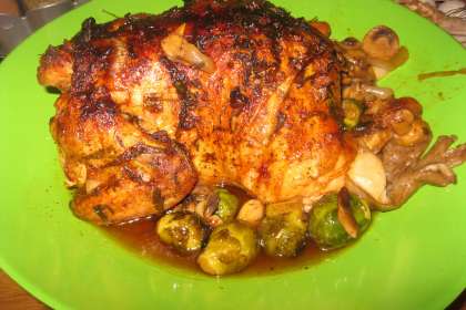 After an hour remove the dish from the oven and add butter, mushrooms, sliced onion and brussel sprouts. Sqeeze 1 lemon over the chicken and vegetables. Add Beer to the dish and sprinkle kosher salt.